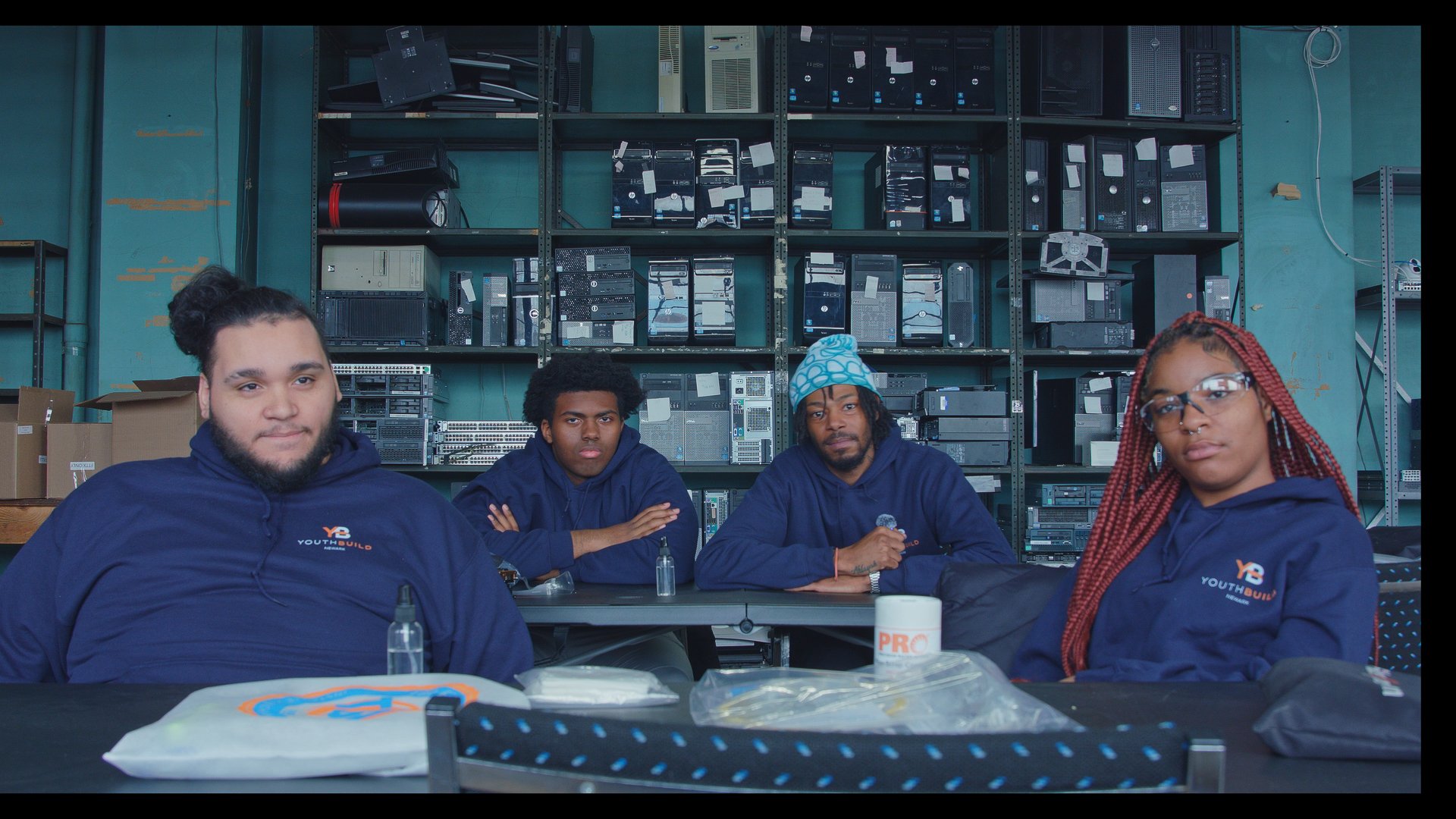 Clockwise from left: Matthew, Taj, Zacore, and Xiomara in their fiber optics workspace at RampUp America’s Newark location